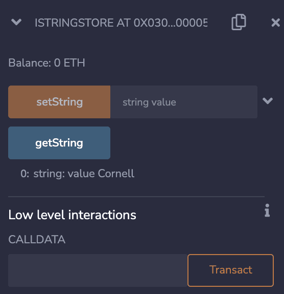 First, we will call the getString function. By default, getString will return whatever was specified in the genesis JSON. Since we set our StringStore precompile to store the string Cornell, it'll return this value.
