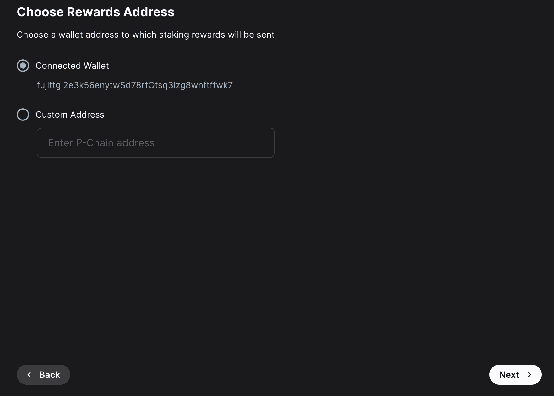 Choose the address that the network will send rewards to. Make sure it's the correct address because once the transaction is submitted this cannot be changed later or undone. You can choose the wallet's P-Chain address, or a custom P-Chain address. After entering the address, click Next.